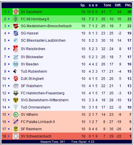 In Homburg entwickelte sich der erwartete heiße Tanz zwischen den beiden Spitzenteams der Liga. Thomas Mischo war nach 15 Minuten zur Stelle und brachte die Nickolaus bei der Regionalliga-Reserve aus Homburg mit 1:0 in Front. Die Antwort des Tabellenzweiten ließ lange auf sich warten, kam dann aber kurz vor der Pause, als Fabio Di Dio Parlopoco nach 41 gespielten Minuten zum 1:1-Ausgleich traf. Bei diesem Ergebnis wurden dann auch die Seiten gewechselt, ehe Schiedsrichter David Uhl aus St. Ingbert nach 60 Minuten vor 150 Zuschauern für Platz sorgte als er David Mischo und Michael Müller mit gelb-rot des Feldes verwies. Mit 10-gegen-10 ging es weiter und der SVG kam damit besser zurecht, als Fabian Weiser nach 64 Minuten zur erneuten Gästeführung traf. Die Partie war aber noch lange nicht entschieden. Erst als Christian Schiel in der 86. Minuten zum 3:1 einnetzte war eine vermeintliche Vorentscheidung gefallen, aber Homburg machte es nochmals spannend, als Ralf Niemann nach 88 Minuten zum 2:3-Anschlusstreffer traf. Gersheim überstand die Schlussphase aber schadlos und durfte über den zehnten Sieg im zehnten Spiel jubeln.