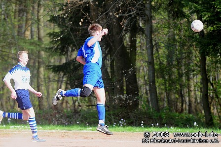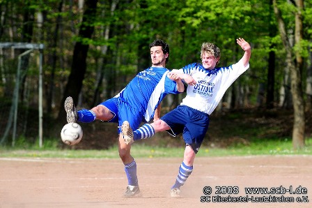 Im direkten Gegenzug zeigte sich auch Blieskastels Schlussmann reaktionsschnell und verhinderte einen zweiten Gegentreffer. Die Offensivabteilung der Gäste fand nun besser zu sich, die anfängliche Überlegenheit der Hausherren war nun dahin. Flavio Baier kam dem Ausgleich nach 20 Minuten schon sehr nahe, traf aber nur das Außennetz. Zwei Minuten später erzielte der SC nach einem kurz ausgeführten Freistoß das 1:1. David Klingen nutzte ein Zuspiel von HP zum Flanken, Schorschel köpfte in der Mitte lehrbuchmäßig ein. Nach einer halben Stunde mussten die Gastgeber einen herben Rückschlag hinnehmen. Zunächst vergab allerdings Flavio Baier frei vor Stefan Kobeluhn. Im vorausgehenden Zweikampf verdrehte sich Michael Welker das Knie und konnte nicht mehr weitermachen. Bis zum Pausenpfiff verlief die Partie weitestgehend ausgeglichen, sodass nach 45 Minuten ein gerechtes 1:1 zu Buche stand.