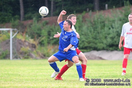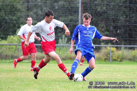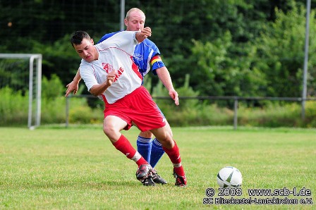 Nach der Pause dann das für Vorbereitungsspiele überliche Bild: Beide Seiten wechselten und so litt der Spielfluss sowohl beim SC als auch beim TuS merklich. Trotzdem waren die Hausherren das agiliere Team und überraschten den in der Rückwärtsbewegung lahmenden SC immer wieder mit schnell vorgetragenen Gegenstößen, mit denen der SC sichtlich Probleme hatte. So kam es auch wie es kommen musste: Ein TuS-Akteur kommt frei zu Flanken und eine tolle Direktabnahme landet im Tor des SC. Nur zwei Minuten später dann aber wieder Hoffnung beim SC: Der just eingewechselte Martin Glasner legt mustergültig auf Flavio Baier, der wenig Mühe hat zum 3:2 einzunetzen. Auf beiden Seiten entwickelte sich nun ein muteres Vergeben von Tormöglichkeiten: Robert Harder war es, der den SC mit drei tollen Paraden in der Partie hielt, bevor aus Blieskastel zwei hochkaräter auf der Strecke lies. Am Ende war es ein Foulelfmeter, der die Entscheidung bringen sollte: Vier Minuten vor dem Ende erzielte der TuS das 4:2 und entschied die Partie endgültig.