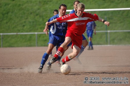 Im Aufeinandertreffen zweier verunsicherter Mannschaften hatten zunächst die Hausherren den besseren Start. In der Anfangsphase verfehlten zwei Kopfbälle das Gehäuse von Robert Harder nur knapp. Die Gäste aus Blieskastel kamen nach zehn gespielten Minuten besser in die Partie und nahmen den Kampf bei sommerlichen Temperaturen an. Wie so oft sah das Kombinationsspiel bis zum Strafraum gut aus, doch die letzte Konzentration beim entscheidenden Pass ließ noch auf sich warten. Immerhin suchte der SC mal den Abschluss, wie etwa Marco Fröhlich der nach einer halben Stunde aus 20m abzog. Seinen Schuss ließ der TuS-Keeper genau vor die Füße von Markus Munk abklatschen, der aus kurzer Distanz sicher einschob. Mit diesem – aus SC-Sicht erfreulichen – Resultat ging es dann in die Pause.