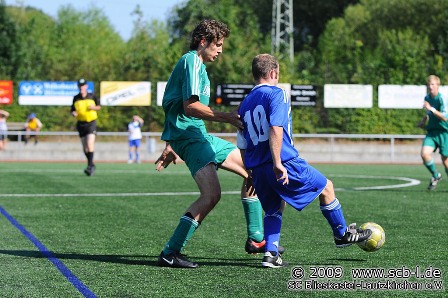Gegen Altheim stand der bis dahin sieglose SC unter Druck und gleich von der ersten Minute an war der SC das aktivere Team. Altheim hatte sichtlich Schwierigkeiten gegen den zweikampfstarken SC und somit schon nach 60 Sekunden die erste brenzlige Situation zu überstehen, als Baier das Tor nur knapp verfehlt. Altheim war nach 10 Minuten zum ersten Mal gefährlich als Hauck freistehend übers Tor köpft. Ansonsten spielte fast nur der SC und nach 22 Minuten wurden die Bemühungen der Hausherren belohnt als Young-Star Kushtrim Agaj ein Solo über 35 Meter zum 1:0 abschließt. Auch nach der Führung spielte der SC konsequenter als die Gäste, vergab aber zunächst einige Einschussmöglichkeiten, die Görßte als Steffen Noserke nur den Pfosten traf. Mehr GLück hatte dann Markus Munk, der mit einem beherzten Schuss aus über 20 Metern zunächst die Latte trifft und der Ball von SVA-Schlussmann Markus Müller ins Netz kullert. Unmittelbar nach dem Treffer schickte der Unparteiische die Akteure in die Pause. Blieskastel führte zur Pause auch in dieser Höhe verdient.