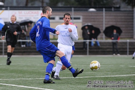 Die Anfangsphase dieses Kellerduells gehörte den Gästen. Bereits nach 32 Sekunden segelte die erste gefährliche Flanke durch den Strafraum der Hausherren, Glasner kam am langen Pfosten einen Schritt zu spät. In der 4. Minute prüfte Baier Hassels Schlussmann Wimmer per Kopf. Baier setzte nach und brachte den Abpraller in die Mitte, wo Sandmeyer das Spielgerät aus kurzer Distanz mit links über den Querbalken jagte. Die erste Chance der Gastgeber ließ sich nach knapp 20 Minuten notieren, Harder parierte sicher, hatte in der folgenden Szene jedoch Glück, dass die hereingeschlagene Flanke auf der Latte landete. Kurz vor dem Pausenpfiff geriet Blieskastels Schlussmann erneut in den Blickpunkt: Obert probierte es mit Gewalt, Harder lenkte das Spielgerät ins Toraus. Auf der Gegenseite das gleiche Bild: Fuhrmann volley, Wimmer zur Ecke. Nachdem Blieskastel die ersten zwanzig Minuten bestimmte, ehe Hassel besser in die Partie kam, ging es nach 45 Minuten bei andauerndem Regen mit einem gerechten Remis in die Kabinen.