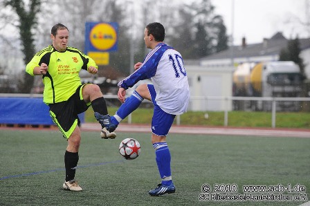 Die Gäste aus Reinheim wirkten zunächst gefährlicher. In der Anfangsphase rettete Harder nach einem Freistoß das 0:0. Keine fünf Minuten später drängte er den heranstürmenden Sene entscheidend vom Tor ab. Blieskastel fand besser in die Partie und gestaltete das Spielgeschehen ausgeglichen. Die erste Möglichkeit durch Müller wurde jedoch wegen einer Abseitsstellung des Angreifers unterbunden. Stumpf setzte mit einem Schuss aus der zweiten Reihe die Zeichen auf Angriff. Nach Leonhardt-Ecke versuchte es Stumpf in der 26. Minute volley, die Reinheimer Defensive blockte den Schuss auf der Linie ab, doch Baier reagierte schnell und drückte das Spielgerät per Kopf über die Linie. Mit einem sehenswerten Freistoß erhöhte Stumpf in der 39. Minute auf 2:0. Reinheim bot sich ebenfalls eine Freistoßmöglichkeit. Harder lenkte die Kugel noch an den Pfosten. Als sich alle schon auf einen 2:0 Pausenstand eingestellt hatten, verkürzte Sene per Kopf auf 2:1. Sein Kopfball wurde noch abgefälscht, Harder ohne Chance.