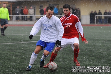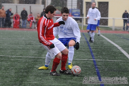 In Blieskastel-Lautzkirchen entwickelte sich ein temporeiches Sechs-Punkte-Spiel in dem beide Team bereits früh wechseln mussten, als Pascal Linn und Sebastian Pieczorek nach einem Zusammenstoß nicht mehr weitermachen konnten. Die erste Chance der Partie hatte dann der SC, als Yannik Moschel knapp das Tor verfehlte, nur eine Minute später rettete Robert Harder den SC vor dem Rückstand. In einer ausgeglichenen Partie war es nach 22 Minuten SC-Kapitän Peter Pusse, der Stumpf-Freistoß das Tor knapp verfehlte. Der SC belohnte sich aber wenige Minuten später für einige gute Offensivaktionen, als zunächst Sebastian Kiefer Peter Pusse in Szene setzt, der auf Yves Klein quer legt und dieser zum 1:0 vollstreckt. Die Freude beim SC war aber nur von kurzer Dauer nutze doch Philipp Dillynur 100 Sekunden später einen katastrophalen SC-Fehlpass zum 1:1-Ausgleich. Weiter hatten beide Teams ihre Chancen: Pusse scheitert zunächst per Kopf, ehe auch der Nachschuss von MArkus Grötsch nicht dne Weg ins Tor von Fabian Huber findet, nur wenig später rettete das Aluminium den SC vorm Rückstand. Noch vor der Pause sollten die rund 100 Fußballfans aber noch ein Tor zu Gesicht bekommen, als ein sehenswerter Weitschuss von Yves Klein den Weg ins Tor findet. Mit der knappen Sc-Führung ging es auch in die Pause.