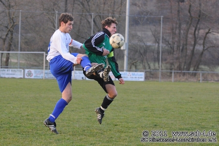 Nur rund 50 Zuschauer, davon rund 35 SCler waren an diesem Faschingssamstag nach Habkirchen-Frauenberg gereist und es ging gleich gut los, als Pascal Linn schon nach wenigen Sekunden einen Moschel-Querpass nicht im Tor versenken konnte. Nur Sekunden später war es Steffen Noserke, dessen Schuss gegen den bereits geschlagenen FCH-Schlussmann Mathieu Herter auf der Linie geklärt wurde. Nach fünf Minuten war dann SC-Schlussmann Harder erstmals gefordert, als er einen Querschläger in der SC-Defensive entschärfte. Die muntere Anfangsphase hatte den Zuschauern einige Torraumszenen zu bieten, was aber auch daran lag, dass beide Teams ein wenig unsortiert agierten. FC-Schlussmann Herter rettete seine Elf erneut vor dem Rückstand, als er einen Stumpf-Schuss abwehren konnte. Ein Querpass wäre in diesem Fall die bessere Alternative gewesen. Wenig später musste SC-Coach Leonhardt den Platz mit einer Zerrung verlassen, für ihn rückte Christian Müller in die Defensive. Die Partie beruhigte sich nun ein wenig, die Hausherren hatten zwar mehr Spielanteile und spielten immer wieder schnell nach vorne, zu echten Chancen kam die deutsch-französische Spielgemeinschaft aber nicht. Acht Minuten vor der Pause dann der letzte Höhepunkt in Durchgang eins: Yannik Moschel verfehlte das Gehäuse nach einem tollen Solo knapp. So ging es mit einem torlosen Remis in die Pause. Die Hausherren hatten zwar mehr Spielanteile, die klareren Torchancen hatte aber der SC zu verbuchen.