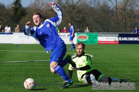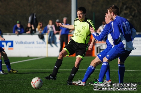 In Biesingen gab es bei wunderschönem Frühlingswetter vor rund 150 Fußballfans ein ereignisreiches Fußballspiel zu sehen, in dem der FV Biesingen forsch zur Sache ging und den SC Blieskastel-Lautzkirchen mit einer engagierten Gangart vor einige Probleme stellte. Auch wenn der FVB zu Beginn das bessere Team stellte, waren es die Gäste aus Blieskastel-Lautzkirchen, die die erste Großchance zu bieten hatten, als Spielertrainer Philipp Niederländer an FVB-Keeper Christian Ramelli scheiterte. Nach 13 Minute war es dann Peter Pusse, der von halblinks einen Schuss gekonnt an den Außenpfosten zwirbelte. Nach 21 Minuten war es dann ein Freistoß aus 20 Metern, der den FV Biesingen jubeln ließ: Sascha Frenzle schoss den Ball unter der SC-Mauer hindurch zum 1:0-Führungstor für den FVB ein, ehe auf der Gegenseite erneut Ramelli zeigt, warum er zu den besten Keepern des Bliestals gehört: Pusse kommt im FVB-Strafraum frei zum Kopfball, Ramelli ist zur Stelle und rettet seine Elf nach 33 Minuten erneut vor dem Rückstand, ehe Pusse nur drei Minuten später einen Kopfball am Tor vorbei setzten. Die Partie hatte schon jetzt einiges an Torraumszenen zu bieten, wobei der SC ein deutliches Chancenplus zu verzeichnen hatte. Der Lohn für die Mühen des SC: Pascal Linn vollendete nach 40 Minuten einen schnell vorgetragenen SC-Angriff zum hochverdienten 1:1-Ausgleich und markierte damit den Schlusspunkt einer ereignisreichen ersten Derbyhälfte.