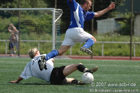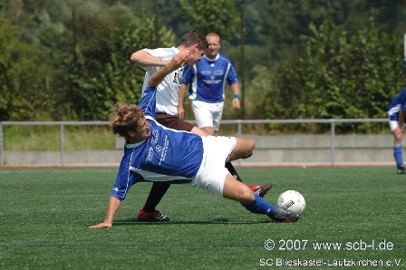 Gegen den Bezirksliga Absteiger aus der Pfalz hatte der SCB bei hochsommerlichen Temperaturen einen echten Härtetest zu bestehen: In der Anfangsphase wurde die Partie vom SCB weitestgehend kontrolliert und die Gäste kamen nur sporadisch vors SC Gehäuse. Blieskastel dagegen kombinierte gefällig und hatte ein ums andere Mal gute Tormöglichkeiten, vergab diese aber leichtfertig. Selbst einen Elfmeter vergab der SCB in Person von Peter Pusse. Trotzdem zeigten die Jungs von der Florianstraße ein engagiertes Spiel mit hohem läuferischen einsatz. Nach gut 20 Minuten gab es dann einen unerklärlichen Bruch im Spiel des SC: Kaum etwas lief zusammen und viele unnötige Fehlpässe prägten das Spielgeschehen, der SCB schien den Witterungsbedingungen Tribut zu zollen. Vom souveränen Spielaufbau in der Anfangsphase war nun nichts mehr zu sehen und so brachte man durch eigene Unkonzentriertheiten die Gäste immer besser in die Partie. Auch das erste Tor der Partie steuerte der SCB bei: Ein Rückpass von Christian Müller ist für Schlussmann Markus Müller nicht mehr zu erreichen und landet zur 1:0 Gästeführung im SC-Gehäuse. Symptomatisch für die Unsicherheit, die sich zusehehns in SC-Spiel eingeschlichen hatte.