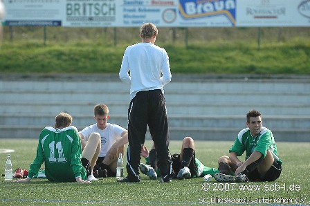 Einzig der Schlussmann der DJK verhinderte mit mehreren guten Paraden einen höheren Rückstand. Nach einer halben Stunde schlug sich die Chancenzahl in weitere Tore um. Leo besorgte mit einem Dropkick nach einer Ecke das 0:2. Kurz vor der Pause wurde Pusse im Strafraum zu Fall gebracht – Elfmeter für den SC. Die Freude hielt sich in Grenzen, verschiedene Akteure hatten in den letzten Wochen vom Punkt aus „kein Glück“. Leo trat an, scheiterte am Torwart, doch Markus Munk erhöhte im Nachschuss auf 0:3. Direkt danach ging es in die Pause.