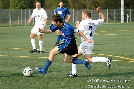 Die Erste tat sich nicht so schwer wie die zweite Mannschaft des SC. Sehr früh brachte Leo die Gäste in Front. Danach konnte man beruhigt aufspielen. Die Hausherren mussten nun reagieren, doch deren Bemühungen verpufften spätestens am Blieskasteler Strafraum. Der SC kontrollierte die Partie und zeigte in der Offensive gefällige Kombinationen. Schließlich traf Alex Schneider, nach einer Flanke von Markus Munk, per Fuß zum mittlerweile verdienten 0:2. Wenige Minuten später scheiterte Leo am starken SV-Schlussmann Peter Bruckmann. Die Überlegenheit der Gäste sollte noch vor der Pause einen weiteren Treffer nach sich ziehen. Freistoß HP Richtung Tor, Leo stand am Fünfer völlig allein und ließ den Ball zum 0:3 gerade über den Scheitel rutschen. Im Anschluss war Pause. Die Führung war auch in dieser Höhe nach 45 Minuten verdient. Dass man nach drei Toren Vorsprung noch nicht gewonnen hat, wusste man aufgrund der schmerzhaften Erfahrung in jüngster Vergangenheit bei der Eintracht 08 Bickenalb.