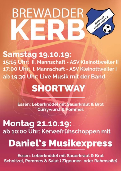 Die SG steht nach 11 Spieltagen und 10 absolvierten Spielen mit neun Punkten auf Rang 12 der Tabelle im Abstiegskampf, während der SC mit 22 Punkten auf Rang fünf steht. Am kommenden Samstag, den 19. Oktober 2019 um 17:00 Uhr steht für die SG in Breitfurt ein ganz besonderes Spiel gegen die ASV Kleinottweiler auf dem Programm: Die "Brewadder Kerb" steht auf dem Terminkalender und neben den Spielen der Aktiven am Samstag hat der SV Breifurt ein breites Programm vorbereitet: