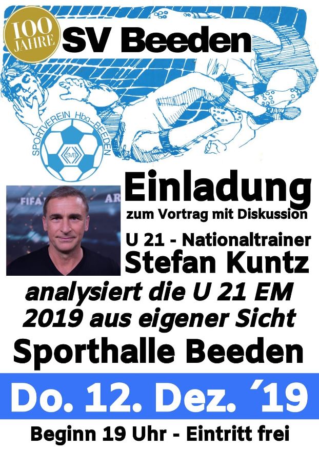 Beim Bezirksligisten des SV Beeden steht am Donnerstag, den 12. Dezember 2019 um 19:00 Uhr ein ganz besonderes Event im Rahmen der Veranstaltungen zum 100-jährigen Vereinsbestehen auf dem Programm: Der U21-Nationaltrainer, ehemalige Nationalspieler und Europameister von 1996 analysiert die U21-Europameisterschaft in der Sporthalle in Beeden. Die Deutsche U21-Auswahl hatte am 30. Juni 2019 das Finale der Europameisterschaft denkbar knapp mit 1:2 gegen Spanien verloren.
