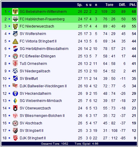 In der Tabelle konnte die SVG Bebelsheim-Wittersheim ihren Vorsprung auf 13 Zähler ausbauen, während sich der FC Habkirchen-Frauenberg und der FC Niederwürzbach auf den 2. Rang schoben. Wolfersheim ist vorerst auf den vierten Rang zurückgefallen. Am unteren Ende der Tabelle stehen weiterhin die Reserven der DJK St. Ingbert und des SV St. Ingbert sowie der SV Alschbach: