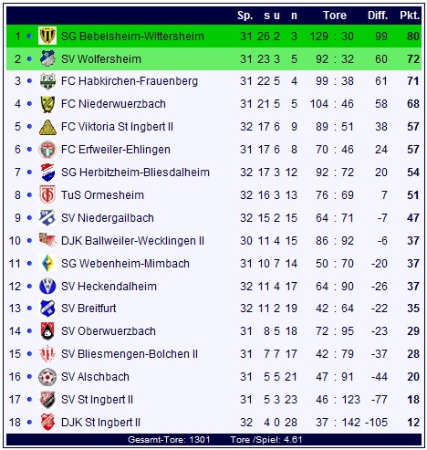 Am morgigen Mittwoch geht es dann richtig zur Sache in der Kreisliga A Bliestal: Die SVG Bebelsheim-Wittersheim kann sich selbst die Meisterkrone aufsetzen und der Konkurrenz bleibt nur das Nachsehen, wenn die SVG den Dreier einfahren sollte. Ein Blick auf die Tabelle offenbart die Brisanz des Aufstiegskampfes: