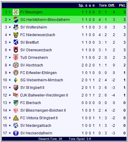 Zwei Remis gab es also am Samstag zu sehen: Am morgigen Sonntag geht es dann für die restlichen Teams zur Sache. Nur der FV biesingen ist spielfrei und muss zuschauen, wenn die Konkurrenz Punkte sammelt...