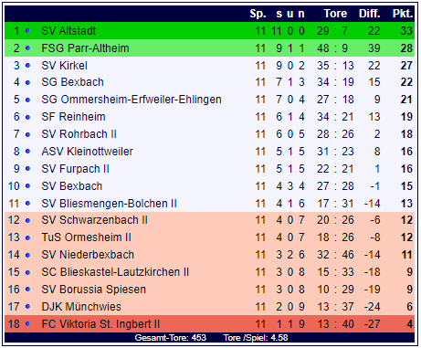 Am neunten Spieltag trennten sich in der Bezirksliga Ost der TuS Ormesheim II und der SV Rohrbach II mit einem 1:1-Remis. Nun wurde für die Partie im DFBnet eine neue Sportgerichts-Wertung festgelegt: Der SV Rohrbach II verliert den Punkt am "grünen Tisch" und die Partie wird mit 0:0 Toren und drei Punkten für den TuS Ormesheim II gewertet. Damit steht der SV Rohrbach II mit 18 Punkten auf Rang sieben der Tabelle, der TuS Ormesheim rückt mit nunmehr 12 Punkten auf Rang 13 der Bezirksliga Ost vor.