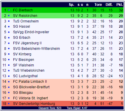 Eine alles andere als alltägliche Situation gab es am 11ten Spieltag der Landesliga Ost in Bierbach: Dort führte der FC Bierbach zur Pause mit 2:1 gegen die Gäste aus Jägersburg. Michael Sievert (13.) und Jonas Holzweisig (20.) hatten den BFC mit 2:0 in Front gebracht, Paul Manderscheid (42.) verkürzte auf 2:1. In der Pause folgte dann der Abbruch der Partie: "Das gestrige Spiel der zweiten Mannschaft beim FC Bierbach musste aufgrund zu vieler verletzter Spieler seitens des FSV Jägersburg in der Halbzeit beim Stand von 2:1 für Bierbach abgebrochen werden.", hieß es vom FSV.