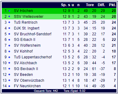 Das Spitzenspiel der Kreisliga A Bliestal zwischen dem SV Höchen und der SSV Wellesweiler musste in der 83. Minute beim Stande von 2:2 aufgrund eingeschränkter Sicht durch Nebel abgebrochen werden. M. Rojan (2., 11.) traf für die Hausherren, G. Rizutto (4.) und A. Krutsch (23.) trafen für die SSV, die in der 71. Spielminute T. Deutsch mit einer Roten Karte verloren hatte. Informationen über die Wertung der Partie liegen uns bis dahin nicht vor.