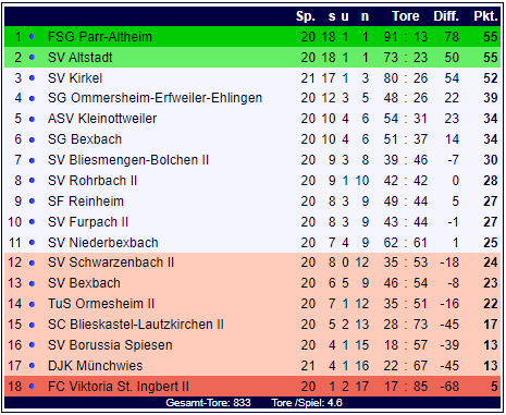 Die Offensivabteilung des SV Niederbexbach ist besonders gefährlich und hat im Durchschnitt mehr als drei Tore pro Spiel erzielt. Die SF Reinheim sollte also besonders aufpassen. Die beiden Mannschaften sind in der Tabelle eng beieinander: Die SF Reinheim hat mit 27 Punkten nur zwei Zähler mehr auf dem Konto und steht auf dem neunten Platz.