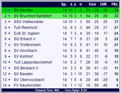 In der Kreisliga A Bliestal, stand der 14. Spieltag - verteilt auf drei Spieltage - auf dem Plan. Der SV Höchen konnte mit 1:3 beim SV Wolfersheim und der SV Bruchhof-Sanddorf mit 1:3 beim TuS Lappentascherhof gewinnen. Beide liefern sich ein Kopf an Kopfrennen um die Plätze eins und zwei. Alle Tore und Spiele bei SCB Online...
