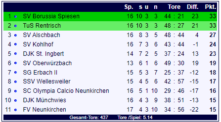 In der Kreisliga A Bliestal stand ein vorgezogener Spieltag auf dem Programm. Es wurde der 32. Spieltag gespielt währed sich die meisten anderen Ligen schon in der Winterpause befanden und es gab drei Spielabsagen. Lediglich zwei Partien konnten stattfinden. Alle Tore und alle Spiele bei SCB Online: