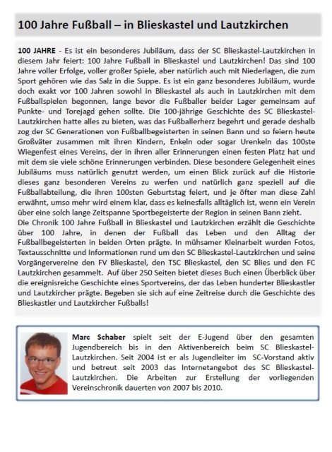 Im Jubiläumsjahr 2010 setzte es für den SC Blieskastel-Lautzkirchen einen Höhepunkt nach dem anderen. Aber auch in den restlichen 100-Jahren war beim SC für einige Geschichten gesorgt. Für den SC Blieskastel-Lautzkirchen Grund genug zum 100-järhigen Wiegenfest eine ganz besondere Erinnerung zu produzieren: "100 Jahre Fußball in Blieskastel und Lautzkirchen - Die Chronik" beschreibt auf fast 300 Seiten alle Facetten der SC Vereinsgeschichte mit hunderten Bildern und Anekdoten.