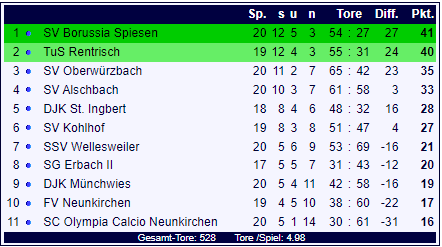 In der Kreisliga A Bliestal gab es am 19. Spieltag wenig Überraschungen. Der TuS Rentrisch musste beim 1:1 gegen die DJK Münchweis Federn lassen und die Borussia aus Spiesen feierte ein Zeitstrafenfestival. Alle Tore und Spiele bei SCB Online...