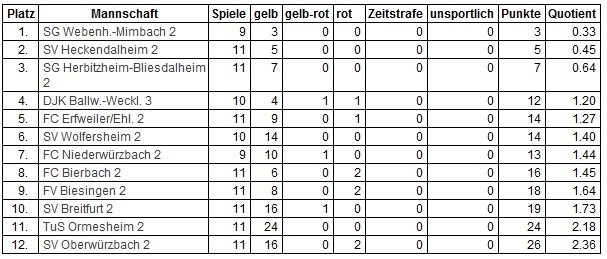 Bei den Reserven ist dagegen die SG Webenheim-Mimbach II das fairste Team der Liga. Lediglich drei gelbe Karten gab es in neun Spielen zu verbuchen, das macht einen Fair-Play-Koeffizienten von 0.33 und die Tabellenführung. Schlusslicht der Tabelle bei den Reserven ist der SV Oberwürzbach II mit 16 gelben und 2 roten Karten: