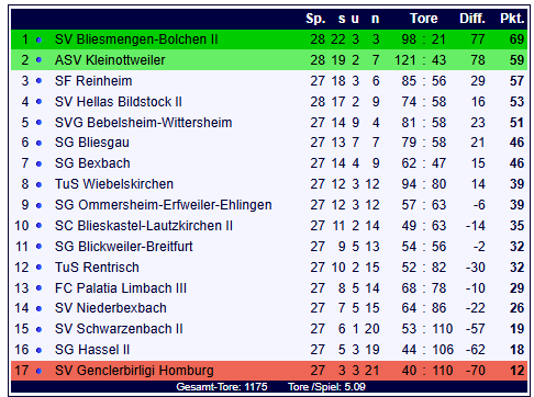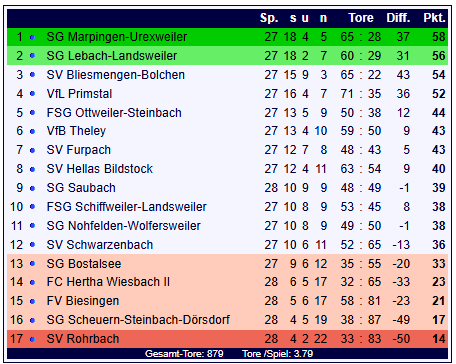 Absteiger: Stand jetzt gäbe es nach dieser Rechnung drei direkte Absteiger den FC Bierbach (16ter), den TuS Ormesheim (15ter) und den SC Ludwigsthal (14ter). SUMME: -3
