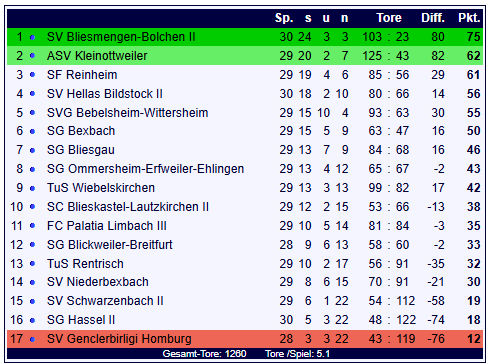 Absteiger: Stand jetzt gäbe es nach dieser Rechnung drei direkte Absteiger den FC Bierbach (16ter), den TuS Ormesheim (15ter) und den SC Ludwigsthal (14ter). SUMME: -3