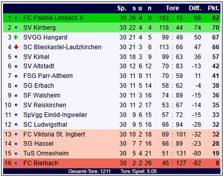 Aufsteiger in die Verbandsliga Nordost: Der FC Palatia Limbach II steigt als Meister der Landesliga Ost direkt auf. Der SV Kirrberg wird als Tabellenzweiter ein Entscheidungsspiel gegen den Vizemeister der Landesliga Nord (FC Uchtelfangen) bestreiten. Wir gehen in allen folgenden Rechnungen davon aus, dass die Vizemeister des Entscheidungsspiel verlieren, wenn dieses Spiel gewonnen wird reduziert sich die Anzahl der Absteiger entsprechend um einen Absteiger. SUMME: -1
