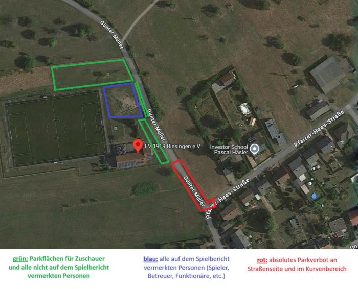 Wichtige Hinweise zur Anreise beim Relegationsspiel in Biesingen: Der FV Biesingen gibt folgende Hinweise zur Anreise und zum organisatorischen Ablauf: "Wir freuen uns am kommenden Freitag das Aufstiegsspiel zur Verbandsliga Nord/Ost ausrichten zu können. Vorab folgende Infos zum organisatorischen Ablauf. Auf dem beigefügten Anhang sind die Parkmöglichkeiten am Sportplatz aufgeführt. Die blau umrandete Fläche stehen ausschließlich den beiden Mannschaften, den Funktionären der beiden beteiligten Vereine, sowie den Schiedsrichtern zur Verfügung. Bitte wenn möglich Fahrgemeinschaften bilden, da die Parkmöglichkeiten begrenzt sind und wir je nach Anzahl der Fahrzeugen nicht jedem Einzelnen einen Parkplatz anbieten können. Bitte wenn möglich für die Spieler und die Funktionäre Zufahrtscheine aushändigen, damit wir die Zufahrt auf dem zugewiesenen Parkplatz erlauben können. Die grün umrandeten Flächen sind Parkplätze für die Zuschauer des Spiels. Auch hier gilt, dass aufgrund der eingeschränkten Parkmöglichkeiten, Fahrgemeinschaften empfohlen werden. Sobald die Parkmöglichkeiten erschöpft sind, besteht nur noch die Möglichkeit im Ort an den Zufahrtsstraßen zu parken. Hier möchten wir Eure Fans bitten, den rot umrandeten Bereich nicht zuzuparken, da aufgrund der Enge der Zufahrtstraße zur Sportanlage dort ein Halteverbot besteht. Das gleiche gilt für sämtliche Kreuzungsbereiche an den Zufahrtstraßen. Wir bitten beide teilnehmenden Vereine ausdrücklich den Fans das Mitbringen von Pyrotechnik zu untersagen. Jede Widerhandlung wird dem Verband gemeldet und es gibt drastische Strafen für das Abbrennen von allem was mit Pyro zu tun hat. So gab es im letzten Jahr teils hohe Strafen (mehr als 3000,00 €) für die Nichteinhaltung dieser Vorgaben. Ich denke, dass kann man sich als beteiligter Verein sparen und sollte lieber beim Verein verbleiben. Wir freuen uns auf ein faires und tolles Fussballspiel und möge der Bessere gewinnen."
