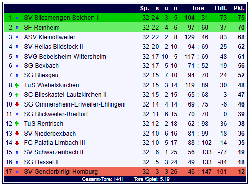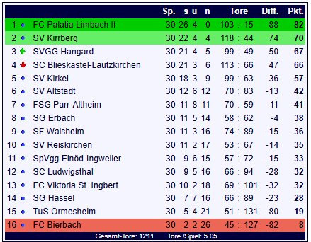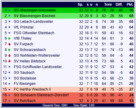 Absteiger:Es gibt daher nur einen direkten Absteiger den FC Bierbach (16ter). Sowohl der TuS Ormesheim (15ter) als auch die SG Hassel (14ter) sind durch den Ausgang der Relegationsspiele gerettet. SUMME: -1