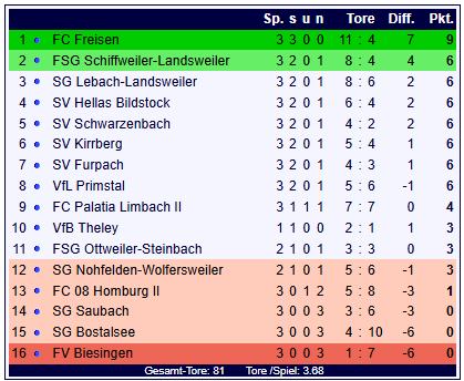 In der comKas-Arena Mühlbach Schiffweiler feierte die FSG Schiffweiler-Landsweiler einen souveränen 3:0-Heimsieg gegen den FV Biesingen. Vor 250 Zuschauern brachte Faruk Ljaic die Gastgeber in der 26. Minute in Führung. Nach einem schönen Steckpass von Maximilian Kohler vollendete Ljaic souverän – sein erstes Saisontor. In der 59. Minute erhöhte Sascha Neumann nach einem Eckball auf 2:0. Die Vorlage kam erneut von Kohler, der damit seine zweite Saisonvorlage verbuchte. Schiffweiler blieb spielbestimmend und hatte durch Faruk Ljaic (80.) eine weitere Großchance, die knapp vergeben wurde. Ein Abseitstor von Ljaic in der 78. Minute wurde zurecht zurückgenommen. Den Schlusspunkt setzte Jan Hinkelmann in der 86. Minute. Nach einem Freistoß von Kohler traf Hinkelmann zum 3:0 – sein erstes Saisontor, Kohlers dritte Vorlage der Saison. In der Schlussminute sah Dennis Mauz von Biesingen zunächst Gelb und anschließend Rot (90.). Biesingen hatte im Spielverlauf durch Quzeem Eniola Obanigba (47.) und Thomas Sell (69.) zwei gute Chancen, blieb aber ohne Torerfolg. In der Tabelle steht Schiffweiler-Landsweiler mit sechs Punkten und einem Torverhältnis von 8:4 auf Rang 2. Biesingen bleibt nach drei Niederlagen mit einem Torverhältnis von 1:7 auf Rang 16.