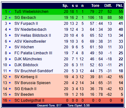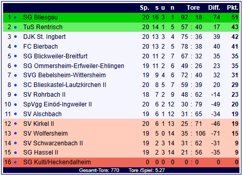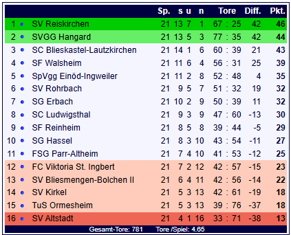 Rang fünfzehn bedeutet nach jetzigem Stand den direkten Abstieg, während Platz vierzehn als unsicher gilt. Genau diese beiden Positionen belegen aktuell punktgleich der SV Kirkel und der TuS Ormesheim. Der TuS Ormesheim konnte das erste direkte Aufeinandertreffen mit 5:2 für sich entscheiden und tritt am Sonntag, den 19. April 2026, zum Rückspiel beim SV Kirkel an. Darüber rangieren die SV Bliesmengen-Bolchen II mit vier sowie der FC Viktoria St. Ingbert mit fünf Punkten Vorsprung, sind damit aber noch nicht endgültig gerettet. Am Tabellenende steht der SV Altstadt, der nach der Winterpause noch ohne Punktgewinn ist und mit lediglich 13 Zählern zunehmend in Richtung Bezirksliga abrutscht.