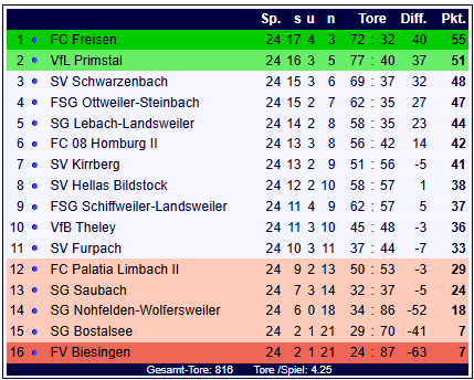 Rang fünfzehn bedeutet nach jetzigem Stand den direkten Abstieg, während Platz vierzehn als unsicher gilt. Wenn der Vizemeister der Landesliga Ost sein Relegationsspiel verliert, würden der SV Altstadt (16.), der SV Kirkel (15.) und der TuS Ormesheim (14.) in die Bezirksligen absteigen.