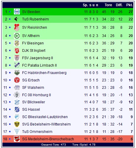 Damit ist der elfte Spieltag komplett und auch die Unebenheiten in der Tabelle wurde in den Wochen-Nachholspielen beseitigt. Ein Blick auf die Tabelle der Bezirksliga Homburg zeigte eine unglaublich enge Spitzengruppe, von der sich der SV Beeden heute ein wenig absetzen konnte. Den Tabellenzweiten aus Rubenheim und den Tabellenneunten aus Habkirchen-Frauenberg trennen nur vier Punkte: