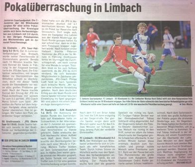 Die C-Jugend der SG SC Blieskastale-Lautzkirchen / SV Kirkel schaffte am Samstag durch einen 2:0-Erfolg bei der Palatia aus Limbach zum dritten Mal in Folge den Einzug ins Achtelfinale des Saarlandpokals und konnte mit dem Verbandsligisten erneut einen Favoriten aus dem Weg räumen, nachdem man eine Runde zuvor schon beim VfB Borussia Neunkirchen gewinnen konnte. Das sorgt auch in der aktuellen Ausgabe des SaarAmateur für Schlagzeilen. Dort heißt es: