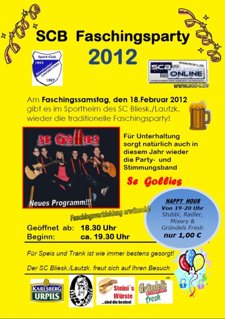 Auch in diesem Jahr darf man sich an Fasching auf ein besonderes Event im SC-Sportheim freuen. Am Faschingssamstag, den 18. Februar 2012 steht ab 19:30 Uhr die Traditionelle Faschingsparty des SC mit Live-Musik von Se Gollies auf dem Porgramm. Zwischen 19:00 und 20:00 Uhr gibt es in der Happy Hour Stubbi, Radler, Mixery und Gründels fresh für 1€.