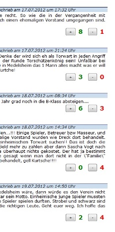Unter jedem Kommentar auf SCB-Online befinden sich zwei Buttuns: Mit einem Klich auf "+" kann man den Kommentar positiv bewerten, mit einem Klick auf "-" kann man ihn negativ bewerten. Die Anzahl der Bewertungen für einen Kommentar werden direkt unter diesem angezeigt: "Rot" für negative Kommentarbewertungen und "grün" für positive. Also das neue Feature gleich testen. Wir wünschen den Usern viel Spaß mit der neuen Funktion, das nun pünktlich zur neuen Saison getestet werden kann!