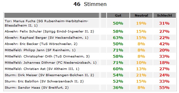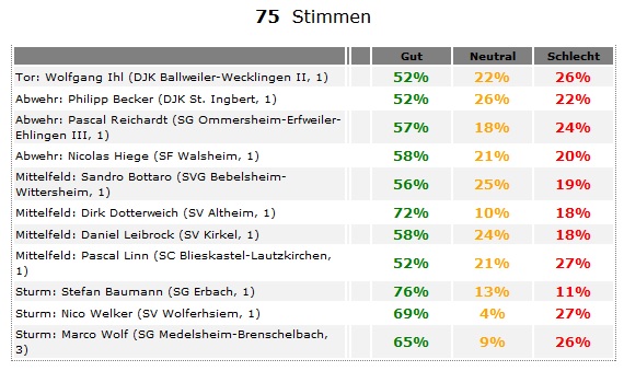 Auch in der Bezirksliga Homburg erhielten zwei Spieler mehr als 70% Zustimmung: Dirk Dotterweich vom SV Altheim landete mit 72% auf Rang zwei, Spieler des Spieltages ist aber mit 76% Zustimmung