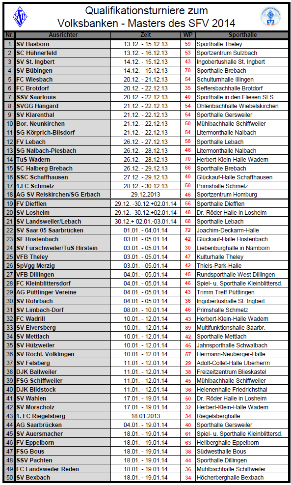 Auch im neuen Jahr geht der Kampf um die Masters-Punkte weiter und die Spannung, wer sich am Ende die Tickets für das große Masters-Finale in der Saarlandhalle sichern kann, wird größer und größer. Auch zum Start ins neue Jahr 2014 gab es erste Punkte zu vergeben und vor allem ein Verein durfte jubeln: Die FSG Schmelz-Limbach sicherte sich einen Turniersieg beim Heimspiel in Schmelz und beim SV Losheim und sammelte somit fleißig Punkte.