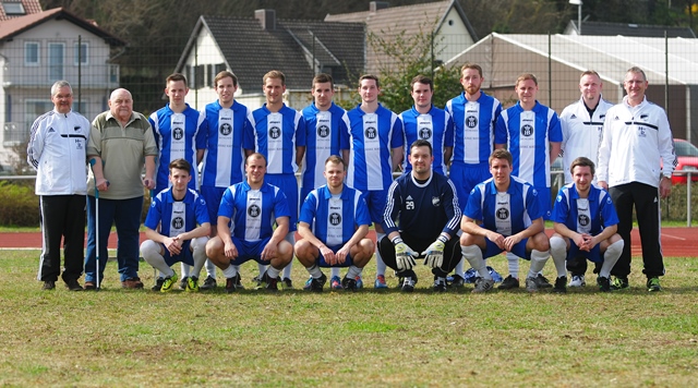 Stehend v.l.: Ferdi Kiefer (2. Vorsitzender), Walter Mattheis (Getränke Mattheis GmbH), Johannes Brengel, Pascal Linn, Peter Pusse, Christian Knoch, Torsten Schmidt, Mathias Meyer, Julian Kowolik, Philipp Niederländer (Trainer), Rainer Blatt (Co-Trainer), Günter Pusse (1. Vorsitzender)