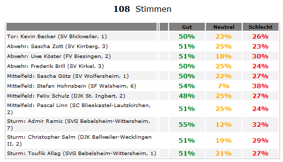 Auch in der Bezirksliga Homburg wurde fleißig abgestimmt: Admir Ramic vom Spitzenreiter der SVG Bebelsheim-Wittersheim sicherte sich am 23sten Spieltag 55% Zustimmung der User. Auf Rang zwei landete Stefan Hohnsbein von den Sportfreunden aus Walsheim knapp dahinter mit 54% der Stimmen.