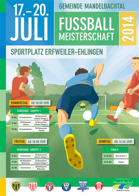 Auch das Mandelbachtal veranstaltet in diesem Jahr eine Gemeindemeisterschaft. Vom 17. bis 21. Juli 2014 ab 18:00 Uhr sucht die Gemeinde beim FC Erfweiler-Ehlingen das beste Fußballteam. Los geht es am Donnerstag, den 17. Juli 2014 mit der Vorrundengruppe 1 mit dem SV Heckendalheim, der SG Ommersheim-Erfweiler-Ehlingen II und dem SV Bliesmengen-Bolchen. Am darauf folgenden Freitag, den 18. Juli 2014 geht es dann mit der Vorrundengruppe 2 weiter: Der TuS Ormesheim, die SG Ommersheim-Erfweiler-Ehlingen und die SVG Bebelsheim-Wittersheim streiten dort um das Finalticket. Am Sonntag, den 20. Juli 2014 findet dann um 14:30 Uhr das Spiel um Platz drei statt, ab 16:15 Uhr steht das Finale der Gemeindemeisterschaft auf dem Programm.