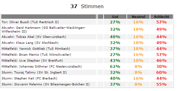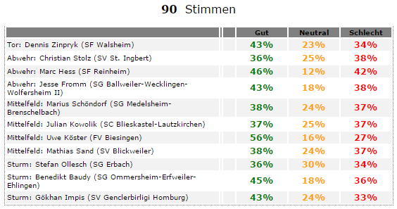 Uwe Köster vom FV Biesingen sicherte sich Spieltag 56% positive Bewertungen, auf Rang zwei landete Marc Hess von den Sportfreunden aus Reinheim.