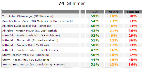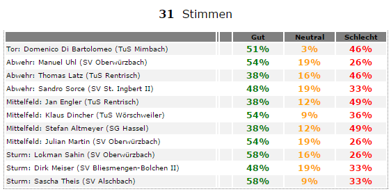 Lokman Sahin vom SV Oberwürzbach mit 58% positiven Bewertungen durchsetzen. Auf Rang zwei landete Sascha Theis vom SV Alschbach.