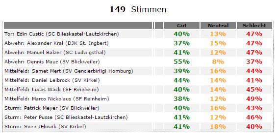 Dennis Mauz vom SV Blickweiler sicherte sich 55% positive Bewertungen, auf Rang zwei landete Daniel Leibrock vom SV Kirkel.