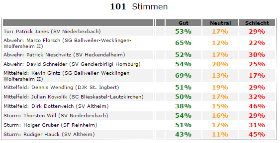 15. Spieltag: Dennis Mauz (SV Blickweiler, 61%), Timo Früh (FC Bierbach, 63%)