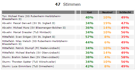 20. Spieltag: Gökhan Cicekci (SV Blickweiler, 77%), Sergio Domizio (SG Hassel, 60%)