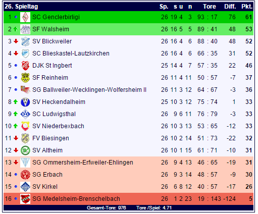 Aus der Spielklasse: Die Spielklasse verlassen wird auf jeden Fall der Tabellenletzte der SG Medelsheim-Brenschelbach, der Meister (derzeit SV Genclebrirligi Homburg) und eventuell der Tabellenzweite sofern dieser das Relegationsspiel gewinnt.